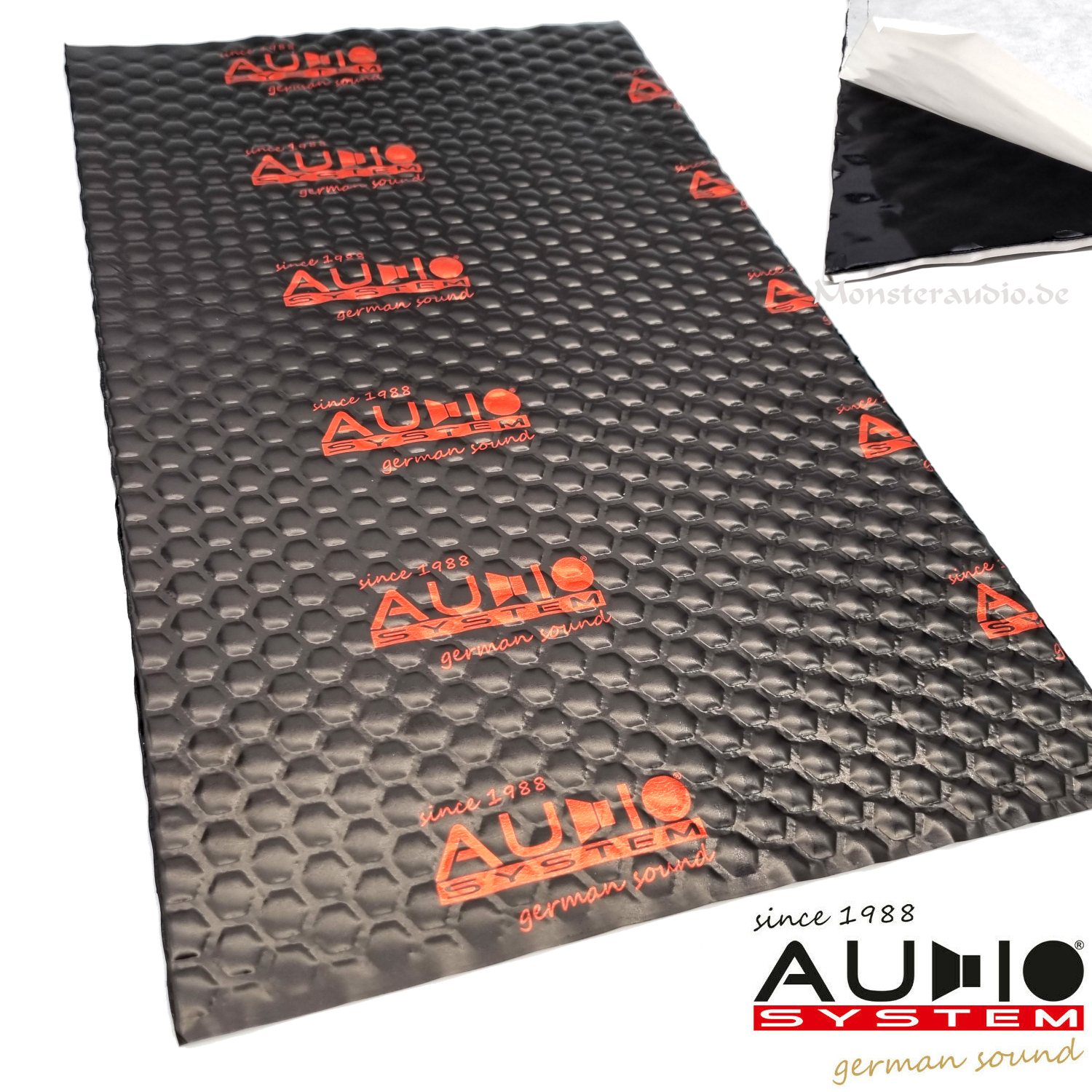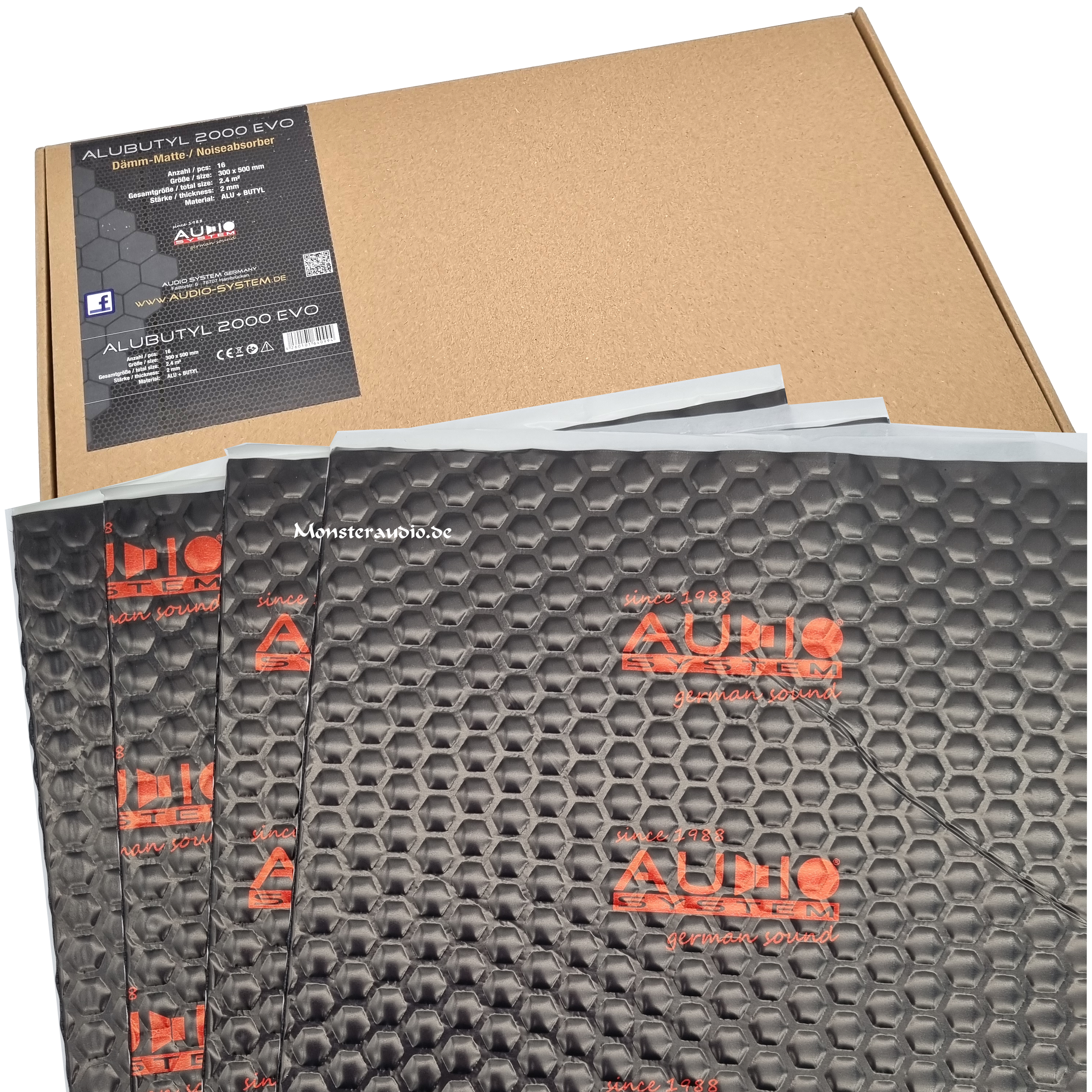 Audio System Alubutyl 2000 EVO Dämmaterial mit starker Aluschicht 16 Matten je 0,5 m x 0,3 m (Gesamt 2,4m²) Dicke (gesamt): 2,00 mm Butyl-Kautschuk: 1,80 mm Alu: 0,2 mm selbstklebend Gewicht pro 1 qm: 3,6 kg