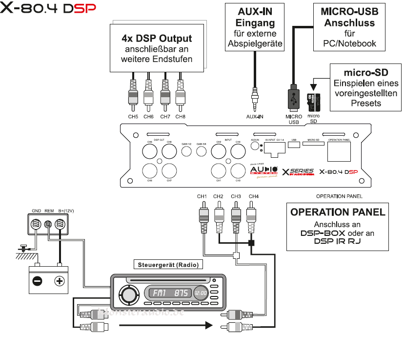 4x DSP RCA Ausgänge (5 Volt), 1x AUX-Eingang, 1x Remote-Ausgang, SD-Kartenslot, Intuitive GUI, Dual-Core-Chip mit