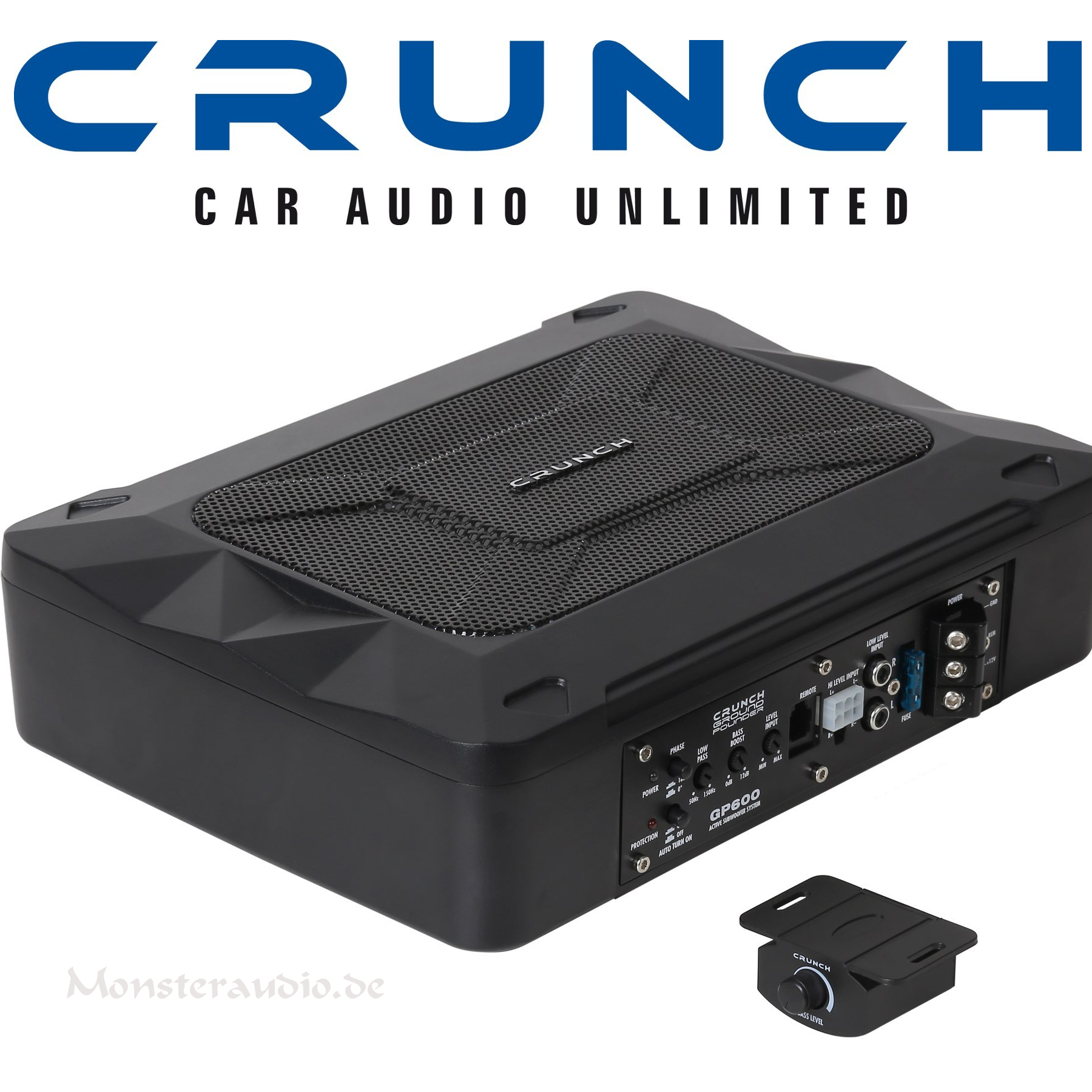 Mit gerade einmal 28,5 x 21 cm ist der neue GP600 der kompakteste Subwoofer im CRUNCH Subwoofer-Sortiment. Wo andere aktive Untersitzsubs aufgrund ihrer Größe häufig keinen Platz finden, ist der GP600 eine echte Alternative. Man kann den Sound, der aus diesem kleinen Wunderkasten kommt, wirklich schon als erwachsen bezeichnen. Hier merkt man einfach, dass sehr viel Know-How nicht nur in dem speziell für ganz kleine, geschlossene Gehäuse entwickelten Subwoofer steckt, sondern dass auch die eingebaute 100 Watt RMS Endstufe einen großen Teil zum guten Klangverhalten beiträgt. Ist der GP600 unter dem Sitz installiert, kann er mit Hilfe der Pegelfernbedienung bequem vom Fahrersitz aus bedient werden. Um den Subwoofer noch besser an die vorhandene Musikanlage anpassen zu können, verfügt er zusätzlich über einen Phasenschalter, LP-Filter und einen regelbaren Bass Boost.