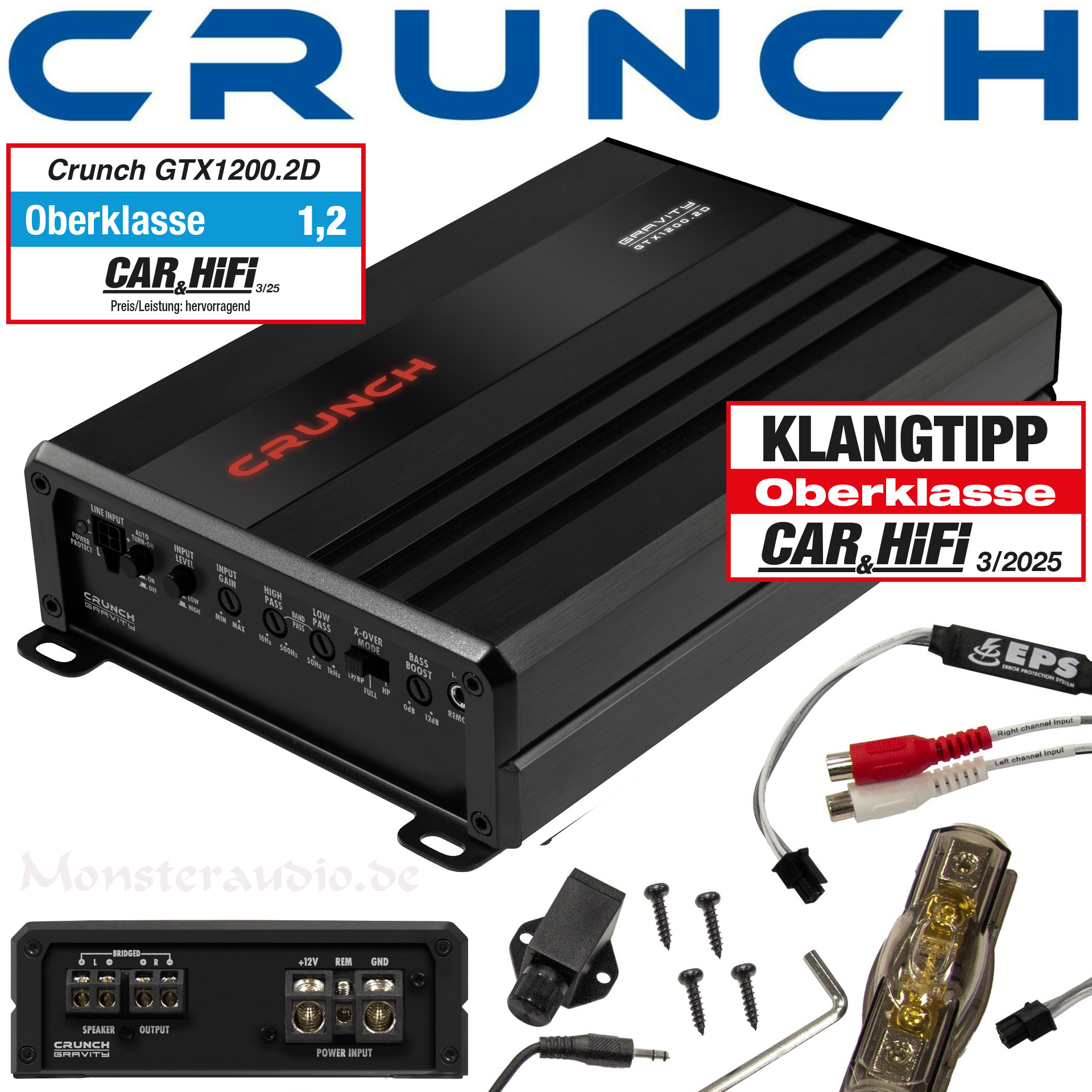 Mit einer äußerst kompakten Bauweise von nur 135 mm Breite und 48 mm Höhe geht die Crunch GRAVITY GTX-Serie mit gleich 10 Modellen an den Start. Doch die wahre Überraschung steckt in der Leistung: Aus den ultrakompakten Kühlkörpern holt Crunch massiv Power bis zu 1.500 Watt RMS!
