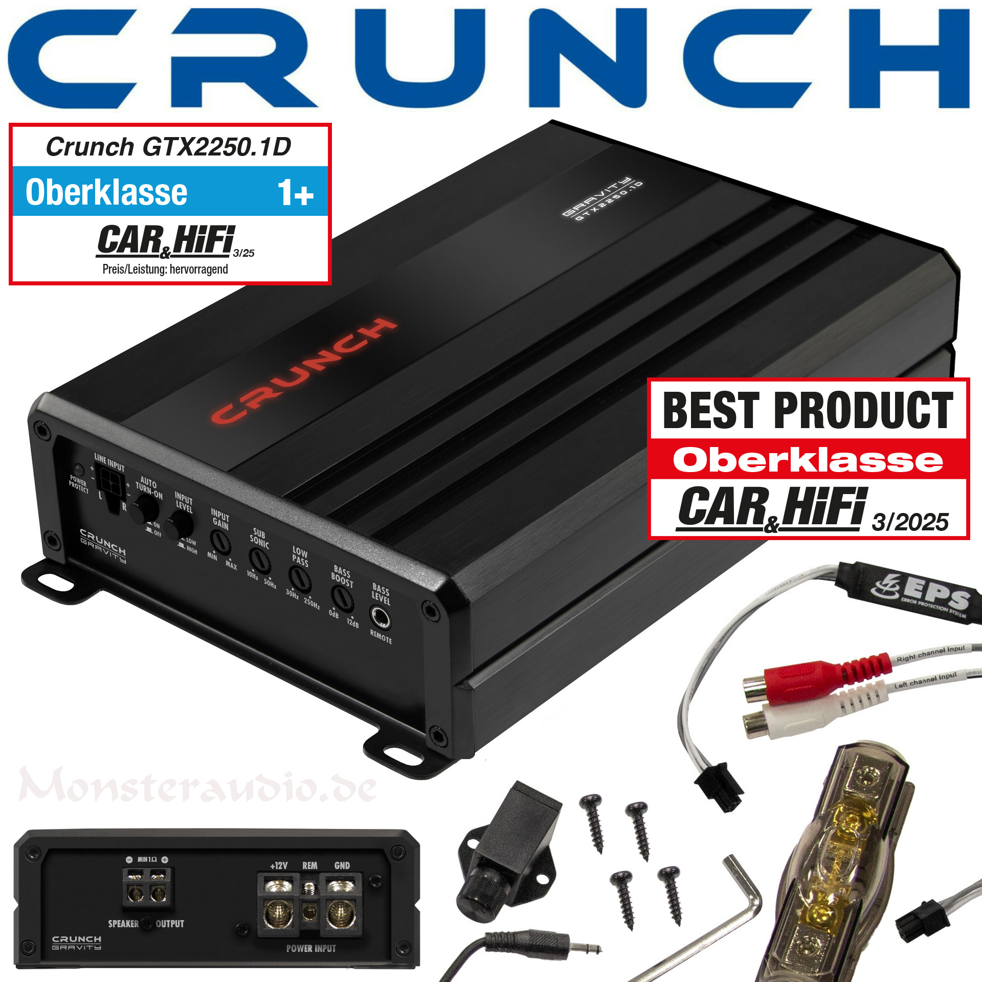 Mit einer äußerst kompakten Bauweise von nur 135 mm Breite und 48 mm Höhe geht die Crunch GRAVITY GTX-Serie mit gleich 10 Modellen an den Start. Doch die wahre Überraschung steckt in der Leistung: Aus den ultrakompakten Kühlkörpern holt Crunch massiv Power bis zu 1.500 Watt RMS!