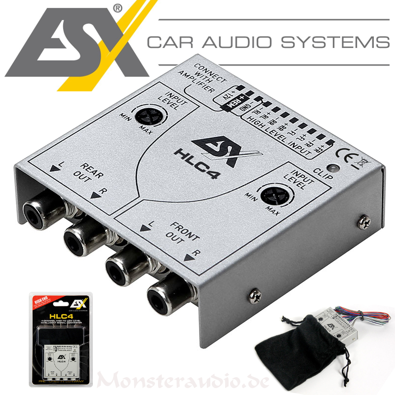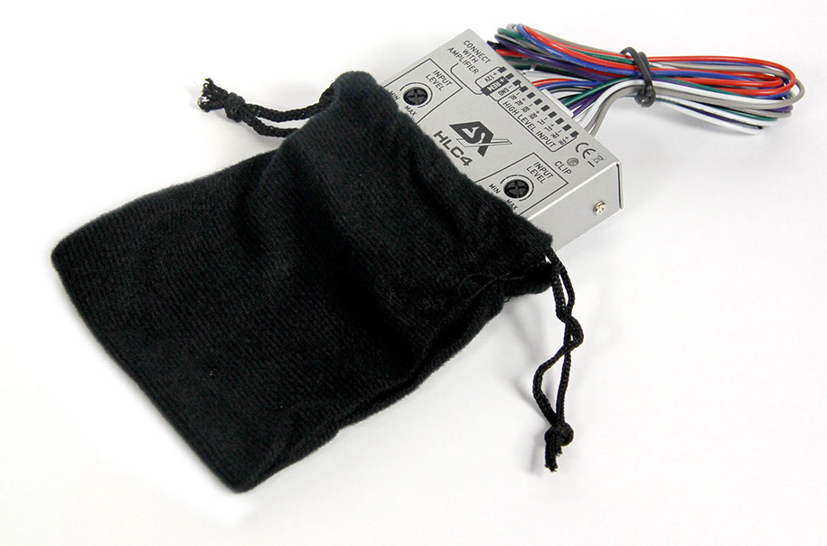 4-Kanal Hochpegel/Niedrigpegel-Signalwandler (Front & Rear), einfache Installation per Plug & Play, Aufbau in modernster SMD-Technologie für maximale Zuverlässigkeit, generiert ein Einschaltsignal (Remote) für Verstärker, Pegelregler für Front & Rear mit Clipping LED, Schutzschaltung gegen Spannungsrückführungen, keine Störsignale und Einschaltgeräusche hörbar dank der „Full Balanced“ Eingangsschaltung mit optimierten Signalwegen, sehr niedriger Ruhestrom, inkl. Samtbeutel als Einbauschutz hinter dem Radio.