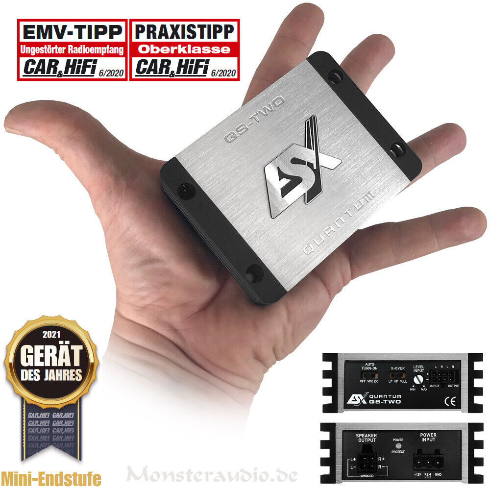 Wer sich bereits über die QM-TWO und deren geringe Abmessungen gefreut hat, sollte sich die neue QS-TWO anschauen. Die ESX Ingenieure haben das Kunststück fertig gebracht, die 2-Kanal CLASS D Endstufe noch weiter zu miniaturisieren. Mit gerade einmal 90 x 70 x 35 mm nimmt sie so eine um 30% geringere Grundfläche ein als die schon vorher nur handtellergroße QM-TWO.