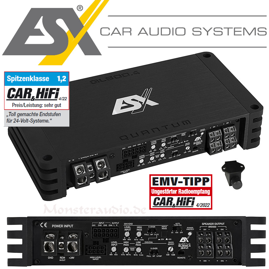 Die im ESX Portfolio ebenfalls brandneuen QUANTUM QL Verstärker sind technisch gesehen die kleinen Geschwister der QE Modelle. Ideal sind sie dort einsetzbar, wo der Einbauplatz sehr knapp bemessen ist. Sie sind ebenfalls emissionsfrei und haben wie die großen QE-Modelle feinste Class-D Technik an Bord, die hinsichtlich Leistung, Soundqualität und Einstellmöglichkeiten keine Wünsche offen lässt. Die Optik und Abmessungen teilen sich die QL Modelle mit den XE-DSP Amps und dem X-DSP Prozessor, so dass durch die Kombination der Geräte hochwertige DSP-Systeme mit viel Power aufgebaut werden können. Die platzsparend einsetzbare Fernbedienung ist ebenfalls bei den QL-Modellen im Lieferumfang enthalten. Die 24V-Versionen können in LKW und Reisebussen mit einem Bordnetz von 24 Volt betrieben werden.