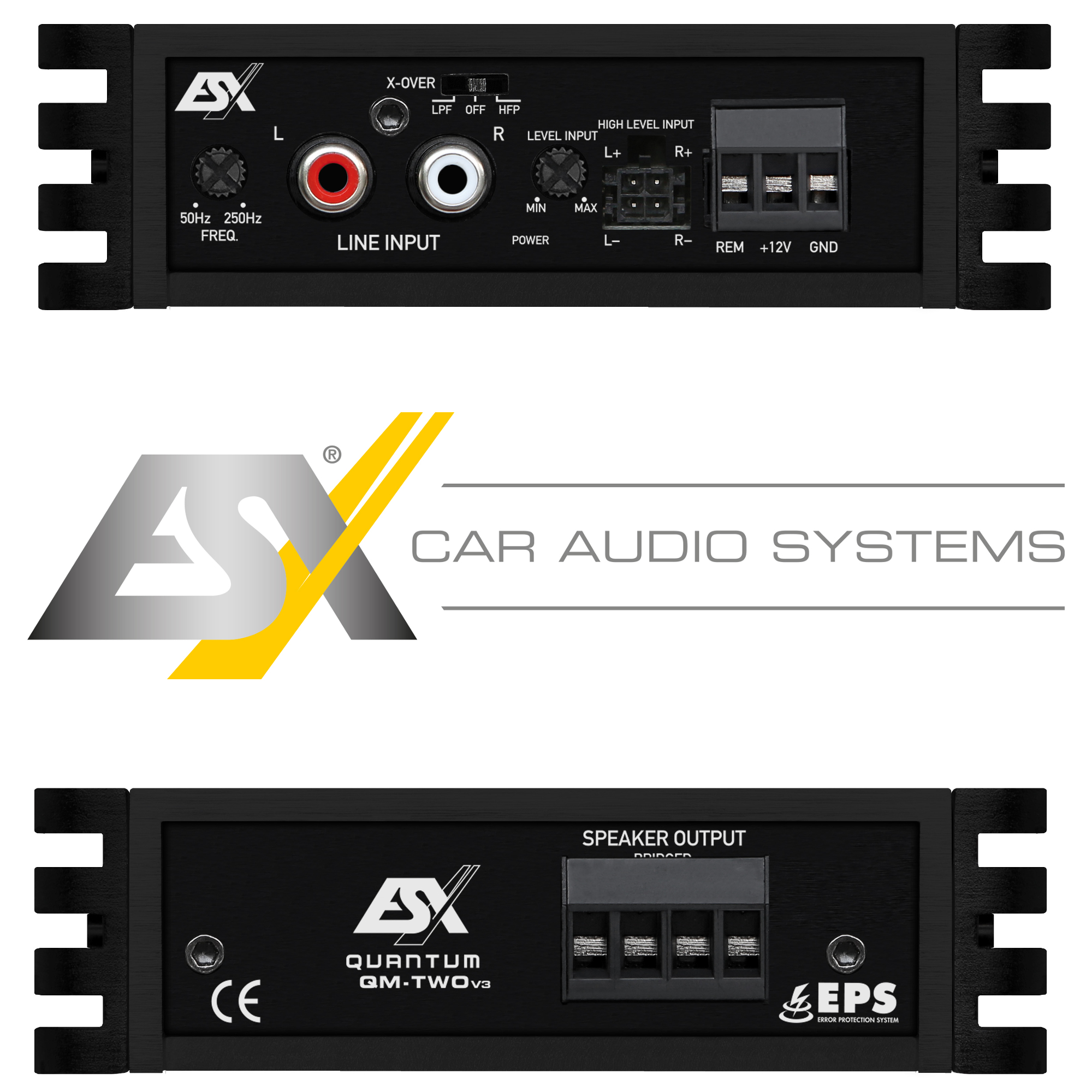 Die Ausstattung der QM-TWOv3 ist sehr hochwertig. Die oft benötigten High-Level-Eingänge mit steckbaren Mini-Molex-Steckern und Einschaltautomatik sind mit bewährter EPS-Technologie ausgestattet. Diese ermöglicht es, die QM-TWOv3 auch in modernen Fahrzeugen mit Werksanlagen und Lautsprecherdiagnose-Systemen zu integrieren, ohne dass Fehler in der Bordelektronik auftreten. Zudem verzichtet ESX nicht auf klassische Cinch-Eingänge: So kann die QM-TWOv3 jederzeit auch direkt hinter DSPs oder High-End-Radios angeschlossen werden.