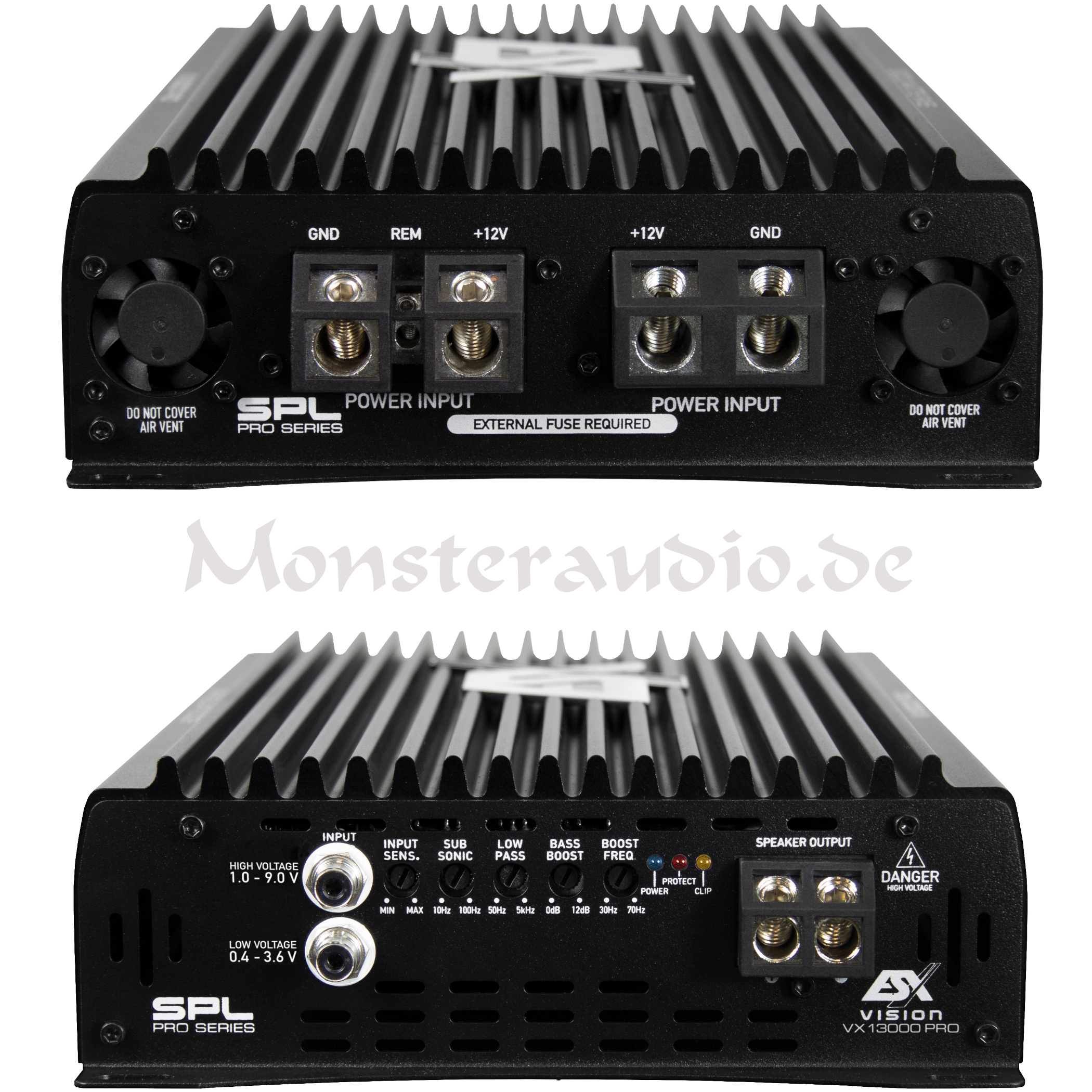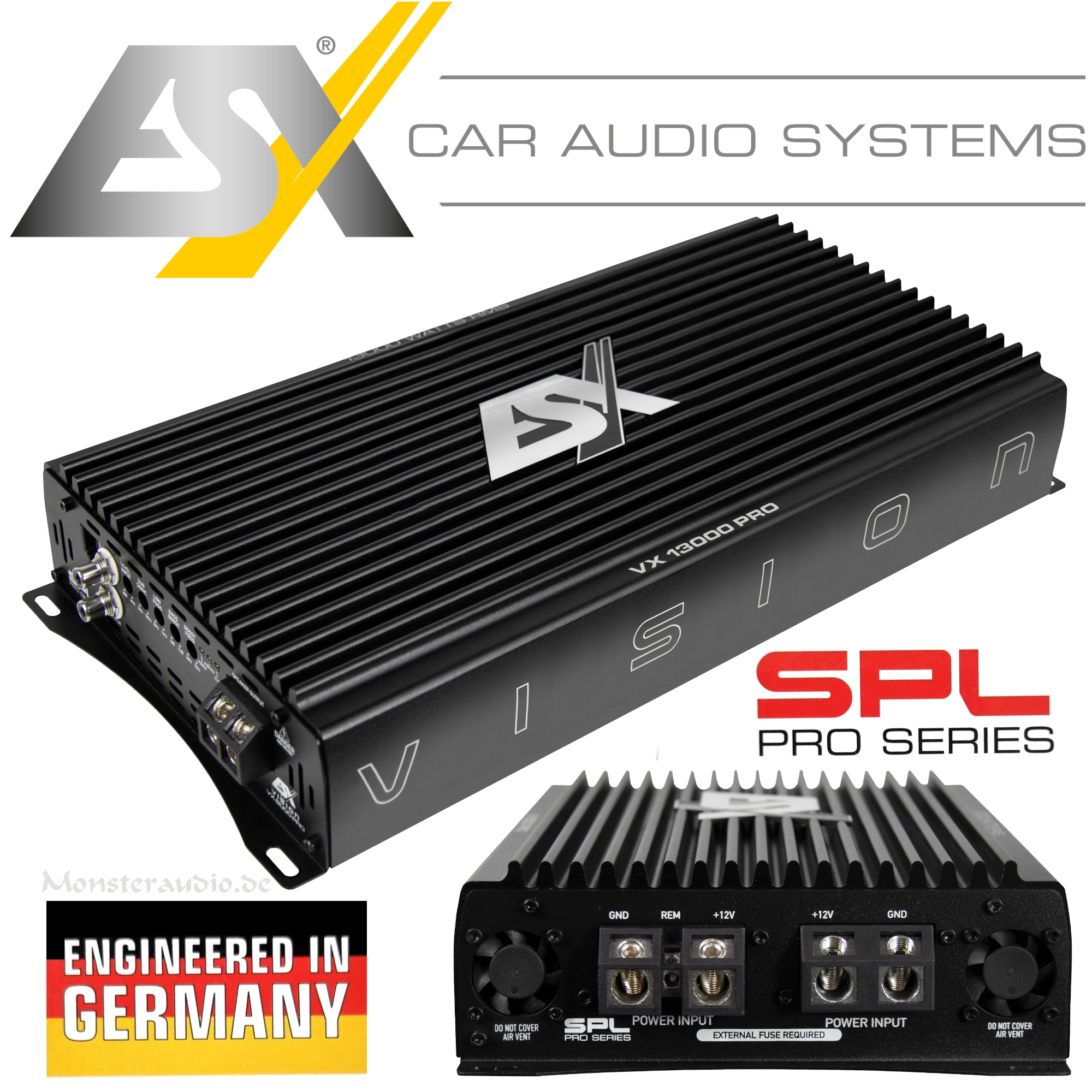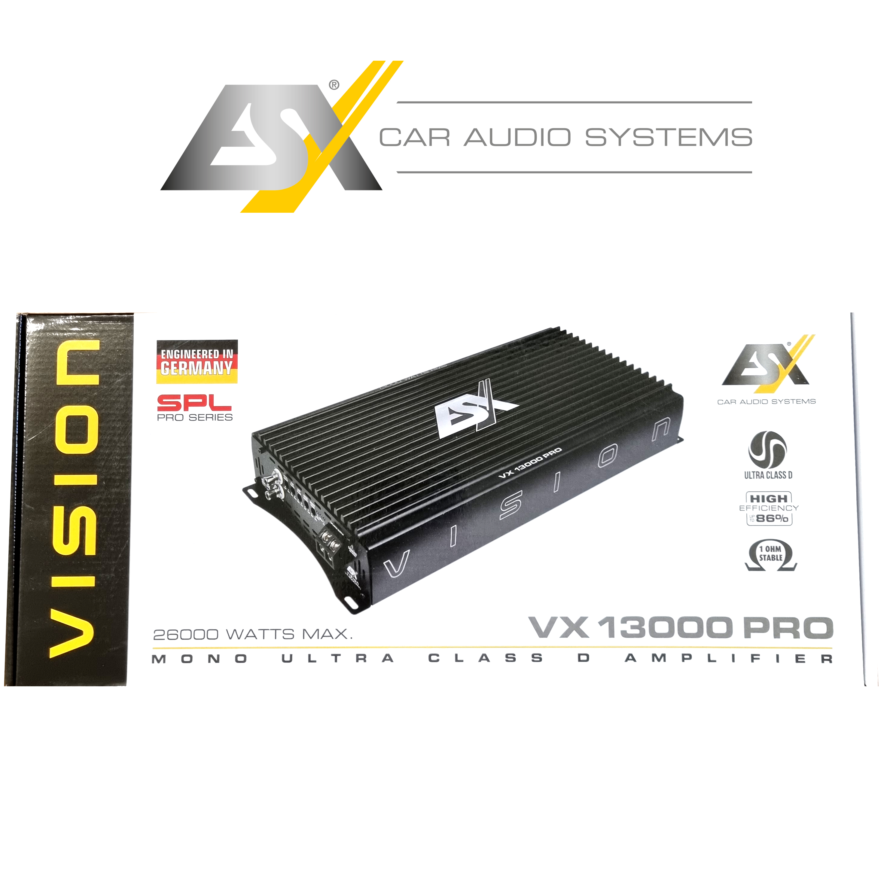 Mit den VISION VX PRO Modellen schlägt ESX ein ganz neues Kapitel auf, in dem es zuerst um Leistung und noch mehr Leistung geht. So bieten die klassisch gestylten Modelle, von denen es gleich fünf Mono-Boliden gibt, unglaublich hohe Leistungen von 2200 bis zu 13000 Watt RMS. Nimmt man die kleine VX2000PRO in die Hand und wirft einen Blick in das Datenblatt, mag man es kaum glauben: Mit einer Grundfläche von rund 20 x 19 cm und einer Leistung von bis zu 2200 Watt RMS an 1 Ohm Ω bringt sie selbst erfahrene Car Audio Urgesteine zum Staunen. Dank der speziellen ESX Schaltungstechnologie sind diese Ergebnisse kein Traum! Damit lassen sich selbst die mächtigsten Subwoofer adäquat befeuern.