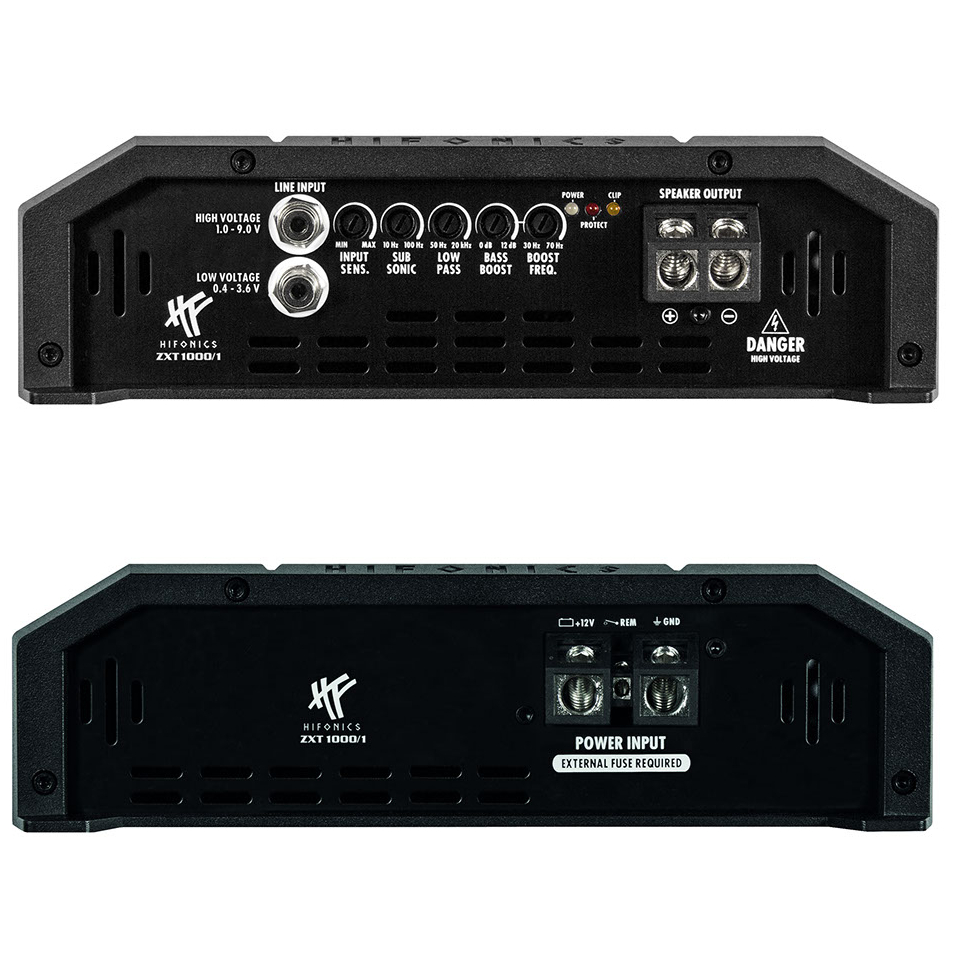 Für die ZEUS EXTREME Serie macht sich HiFonics hierbei die neuesten Entwicklungen und Verbesserungen modernster Halbleiter zunutze. Während Class A/B immer einen Kompromiss zwischen Klang und Leistungswirkungsgrad erzwingt, verbessert sich bei Class D Effizienz und Klang gemeinsam. D.h. mit einem verstärkten Wirkungsgrad wird sich auch die Audio Performance erhöhen. Ein weiterer Vorteil ist, dass man bei einem sehr hohem Wirkungsgrad auf große Kühlkörper verzichten kann. Wie im Fall der ZXT Extreme Endstufen, die mit Werten um 90% aufwarten. So ist die ZXT5000/1 mit 5.000 Watt RMS und einer Grundfläche von 27,8 x 21,5 cm sogar etwas kleiner als ein DIN A4 Blatt! Unglaublich. Das Sortiment umfasst im Bereich der Monoblöcke fünf Modelle mit Leistungen von 2.200 bis hin zu extremen 13.000 Watt RMS. Was auch sofort auffällt: Die wunderschön gefertigten Kühlkörper mit eingefrästen Modellbezeichnungen, Diamantschliff-Emblemen und aus vollem Aluminium gezogenen End-Caps mit HIFONICS Logo. Ein Traum.