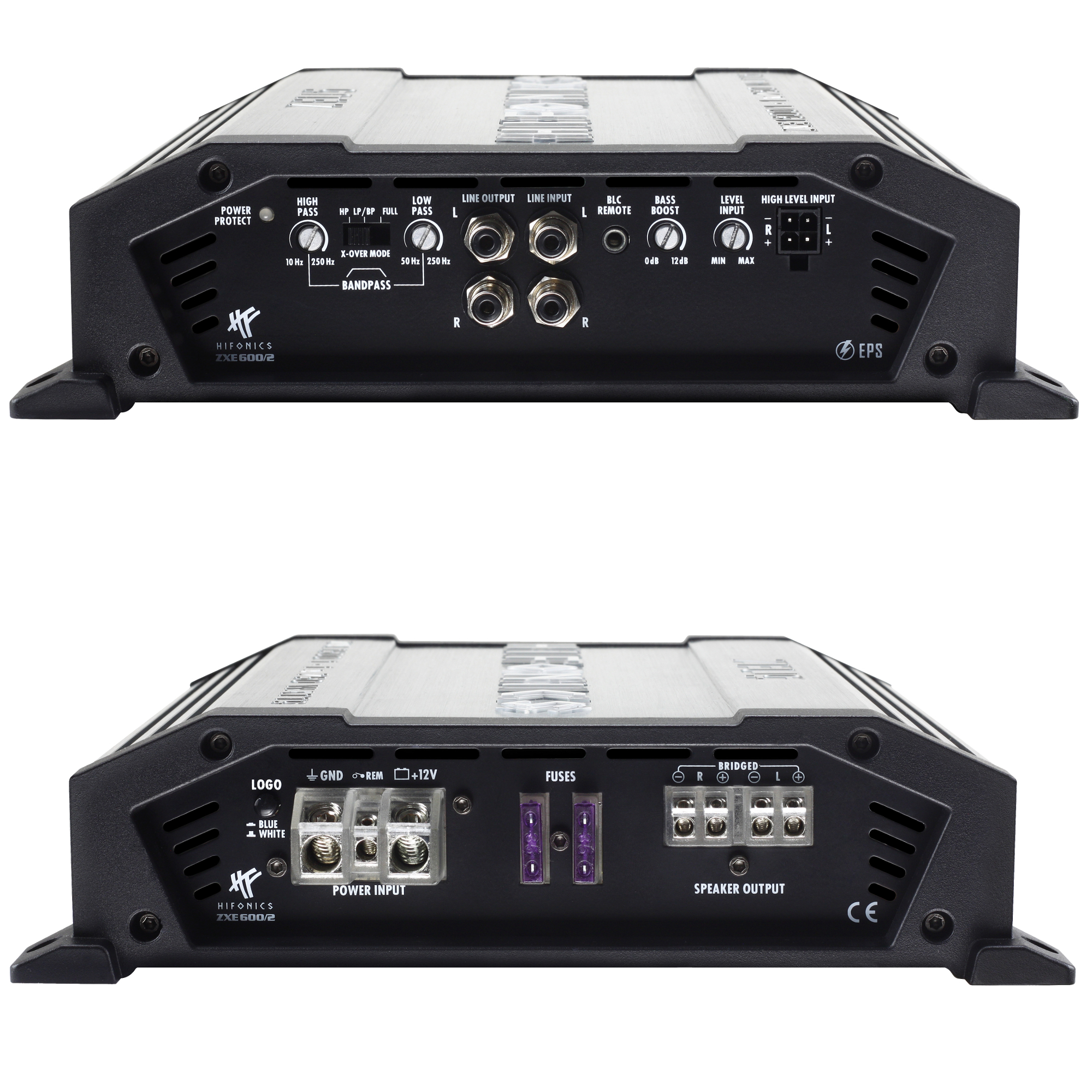 Die neuen HiFonics ZEUS EVOLUTION ZXE Verstärker besitzen schon ab Werk hochfunktionale Features wie Hochpegel-Eingänge mit EPS, Einschaltautomatik, Start-Stopp-Fähigkeit, voll regelbare Weichen, Bandpass-Funktion, Bass-Pegelfernbedienung und sind damit perfekt für den multiplen Einsatz in modernen Car Hifi Systemen gewappnet. Bei der Auswahl der Komponenten im Innern wurde ebenfalls nicht gespart: So kommen aufwendige und teure NE5532 Operationsverstärker zum Einsatz, die normalerweise nur in viel teureren Modellen zu finden sind. Das Resultat verblüfft nicht nur durch hohe Leistung, sondern auch durch unglaublich feinen Klang. Der gebürstete, in grau gehaltene Alu-Kühlkörper ist schon eine Augenweide an sich. Die schwarzen Endcaps aus Aluminium-Guss unterstreichen zusätzlich die Wertigkeit der ZEUS EVOLUTION ZXE Serie. Optisches Highlight ist das beleuchtete HiFonics-Logo, das sich von blau auf weiß umschalten lässt. Aber nicht nur das Logo ist beleuchtet, auch die Strom- und Lautsprecheranschlüsse strahlen in HiFonics blau und sorgen für ein weiteres optisches Highlight.