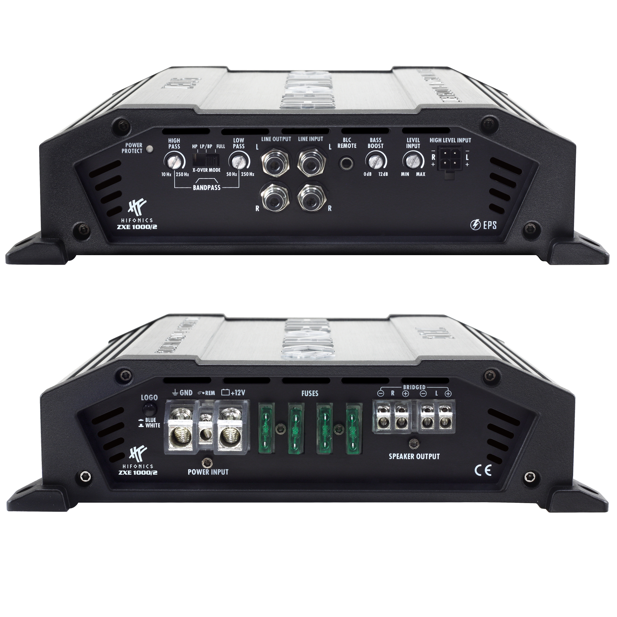 Die neuen HiFonics ZEUS EVOLUTION ZXE Verstärker besitzen schon ab Werk hochfunktionale Features wie Hochpegel-Eingänge mit EPS, Einschaltautomatik, Start-Stopp-Fähigkeit, voll regelbare Weichen, Bandpass-Funktion, Bass-Pegelfernbedienung und sind damit perfekt für den multiplen Einsatz in modernen Car Hifi Systemen gewappnet. Bei der Auswahl der Komponenten im Innern wurde ebenfalls nicht gespart: So kommen aufwendige und teure NE5532 Operationsverstärker zum Einsatz, die normalerweise nur in viel teureren Modellen zu finden sind. Das Resultat verblüfft nicht nur durch hohe Leistung, sondern auch durch unglaublich feinen Klang. Der gebürstete, in grau gehaltene Alu-Kühlkörper ist schon eine Augenweide an sich. Die schwarzen Endcaps aus Aluminium-Guss unterstreichen zusätzlich die Wertigkeit der ZEUS EVOLUTION ZXE Serie. Optisches Highlight ist das beleuchtete HiFonics-Logo, das sich von blau auf weiß umschalten lässt. Aber nicht nur das Logo ist beleuchtet, auch die Strom- und Lautsprecheranschlüsse strahlen in HiFonics blau und sorgen für ein weiteres optisches Highlight.