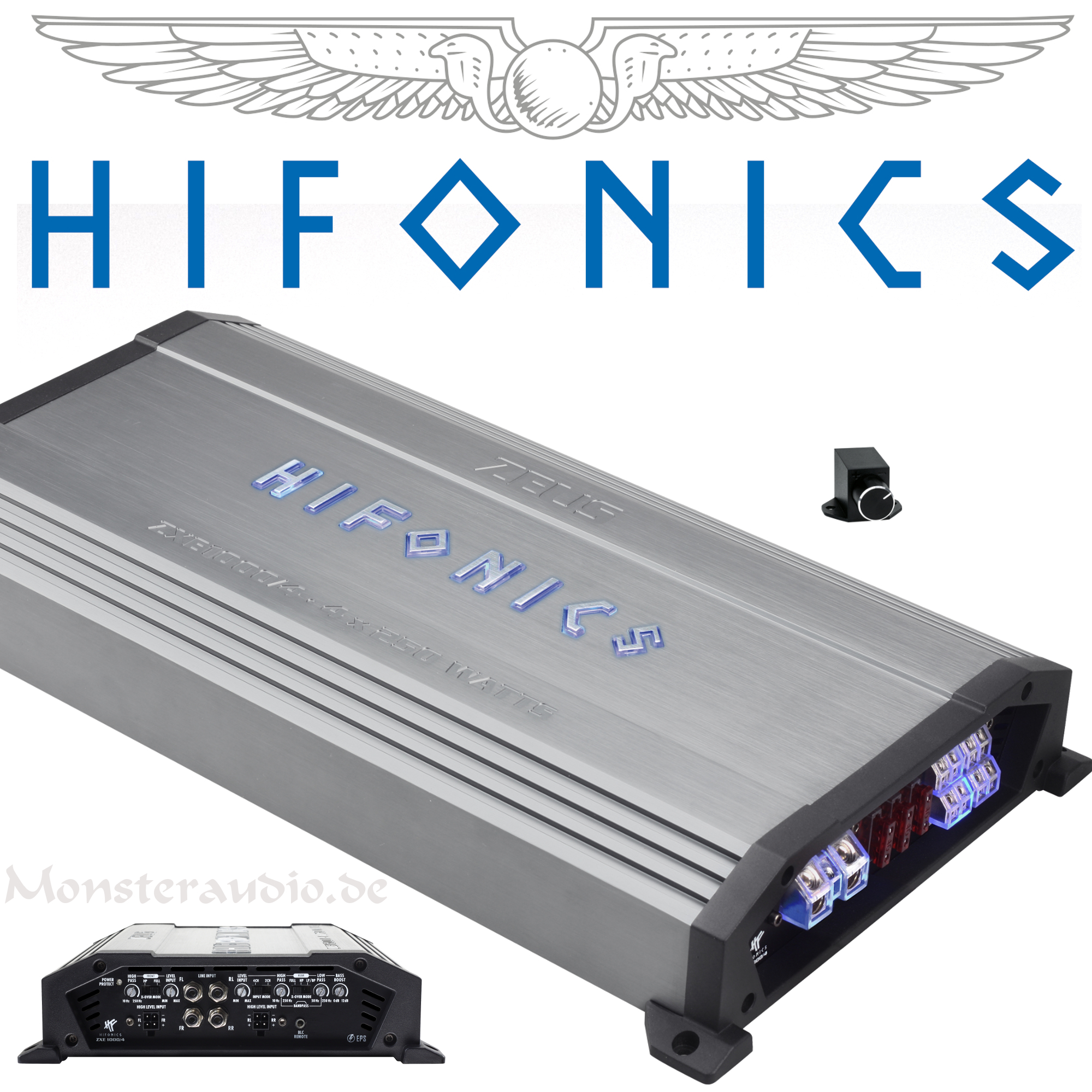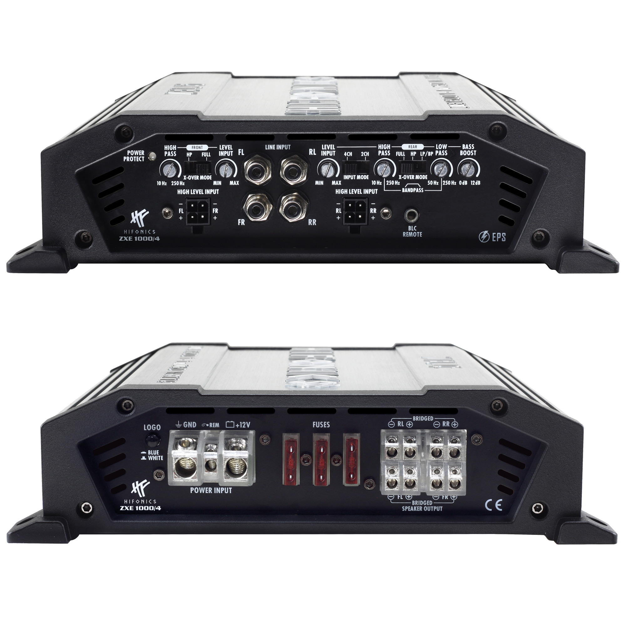 Die neuen HiFonics ZEUS EVOLUTION ZXE Verstärker besitzen schon ab Werk hochfunktionale Features wie Hochpegel-Eingänge mit EPS, Einschaltautomatik, Start-Stopp-Fähigkeit, voll regelbare Weichen, Bandpass-Funktion, Bass-Pegelfernbedienung und sind damit perfekt für den multiplen Einsatz in modernen Car Hifi Systemen gewappnet. Bei der Auswahl der Komponenten im Innern wurde ebenfalls nicht gespart: So kommen aufwendige und teure NE5532 Operationsverstärker zum Einsatz, die normalerweise nur in viel teureren Modellen zu finden sind. Das Resultat verblüfft nicht nur durch hohe Leistung, sondern auch durch unglaublich feinen Klang. Der gebürstete, in grau gehaltene Alu-Kühlkörper ist schon eine Augenweide an sich. Die schwarzen Endcaps aus Aluminium-Guss unterstreichen zusätzlich die Wertigkeit der ZEUS EVOLUTION ZXE Serie. Optisches Highlight ist das beleuchtete HiFonics-Logo, das sich von blau auf weiß umschalten lässt. Aber nicht nur das Logo ist beleuchtet, auch die Strom- und Lautsprecheranschlüsse strahlen in HiFonics blau und sorgen für ein weiteres optisches Highlight.