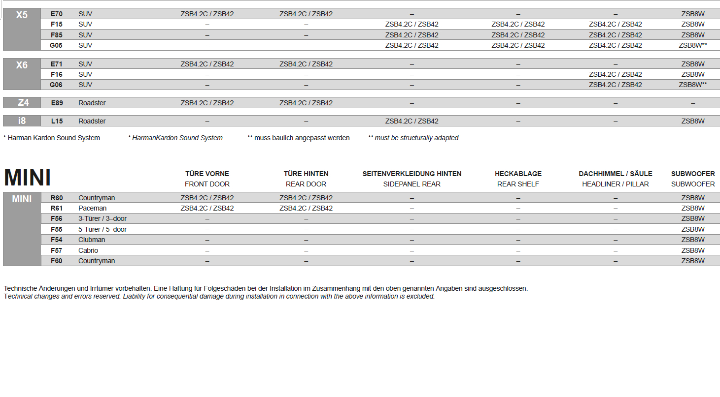 HiFonics bietet mit der ZEUS ZSB Serie erstmalig fahrzeugspezifische Lautsprecher für BMW/Mini. Besondere Highlights der ZEUS ZSB Serie sind unter anderem die aufwendig gefertigten Subs. Während herkömmliche Woofer oft mit günstigen, dafür aber schweren und wenig effizienten Ferrit-Magneten bestückt sind, bestechen die leichten ZSB8W Modelle mit modernen und hocheffizienten Neodym-Magneten. Diese Antriebsart sorgt in Kombination mit den großen 50 mm Schwingspulen und formstabilen Glasfasermembranen für kräftige und knackige Bässe! Auch bei den passgenauen 10 cm Lautsprechern kommen Neodym-Magnete zum Einsatz. Diese sind ebenfalls leicht und effizient und haben darüber hinaus eine geringe Einbautiefe. Komplettiert werden die Vollbereich-Lautsprecher mit feinzeichnenden Gewebe-Neodym-Hochtönern. Alle fahrzeugspezifischen Adapter, Kabel samt Einbauzubehör befinden sich im Lieferumfang, wodurch die Plug+Play Installation erheblich vereinfacht wird.
