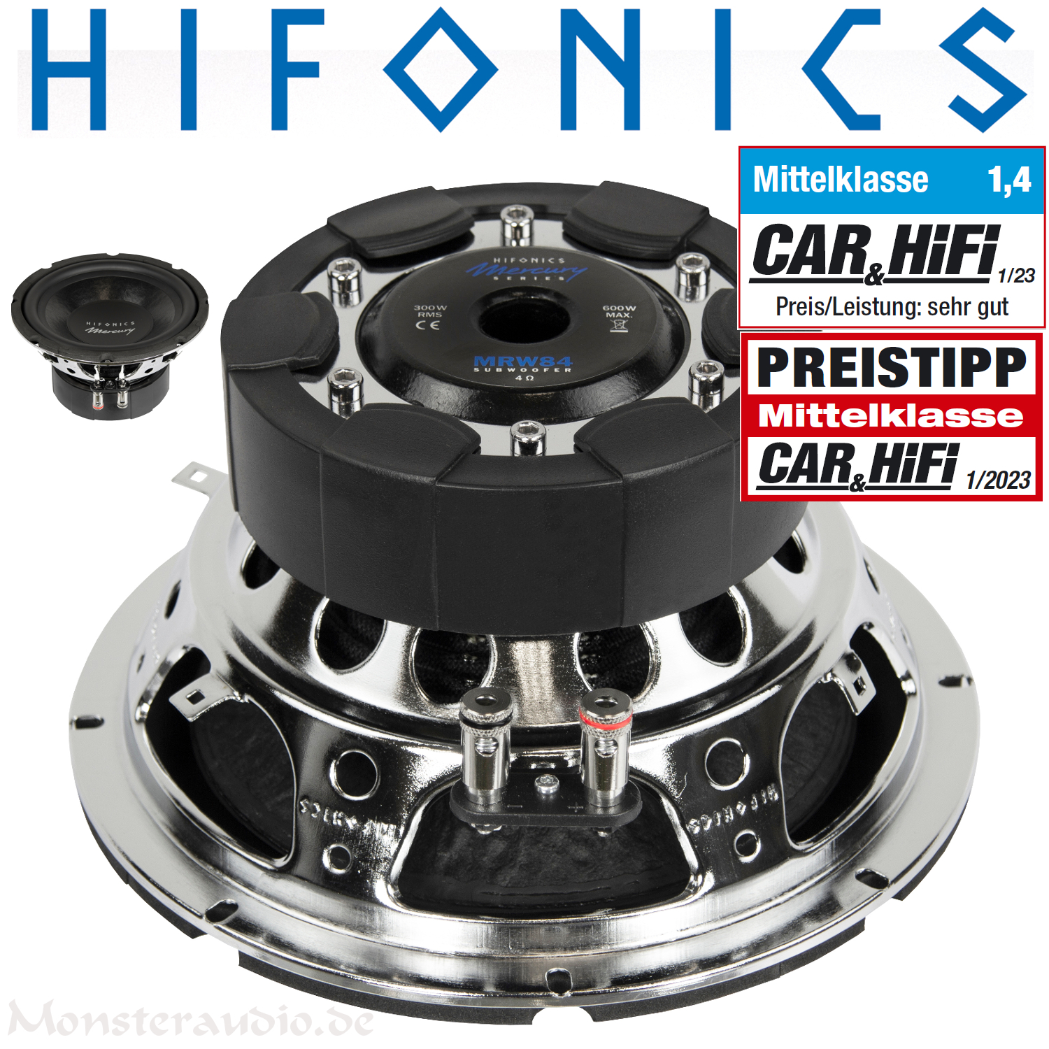 Der optimale Einsatzzweck der beiden MERCURY Subwoofer MRW104 und MRW84 lässt sich im Bassreflex- oder Bandpass-Bereich verorten. Dadurch dass die Woofer relativ kleine Volumen brauchen, bietet sich die Verwendung mehrerer Subwoofer an. Beispielsweise schafft ein MRW84 in einem 20 Liter Bassreflexgehäuse bereits eine extrem tiefe untere Grenzfrequenz (-3 dB) von 32 Hz! Mit geringen Tiefbass-Einbußen, dafür aber mit umso mehr Dynamik und trockenem Bass sind die Subs auch für den Einsatz in kleinen geschlossenen Gehäusen sehr zu empfehlen.Die Qualität der MERCURY Subwoofer ist außergewöhnlich: Mit den gelochten Stahlkörben im HiFonics Design setzen sie dabei nicht nur optische Akzente, auch die Auswahl der eingesetzten Komponenten ist überzeugend: Geschöpfte Papiermembranen, langlebige Gummisicken sowie robuste Spider sind die Zutaten. Selbst der kleine MRW84 mit 20 cm Durchmessern kann wie sein großer Bruder MRW104 bereits mit einer sehr groß dimensionierten 50 mm Schwingspule aufwarten. Optisch überzeugen beide Woofer mit einem verchromten Korb und Magnet-Boot, so dass sie auch in invertierten Einbauten wie in den Mercury-Boxen mit Blick auf den Korb besonders gut zur Geltung kommen.