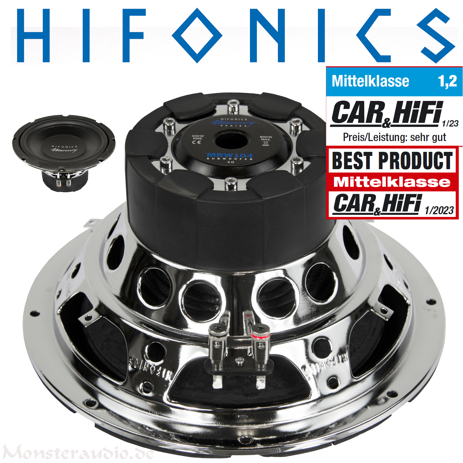 Der optimale Einsatzzweck der beiden MERCURY Subwoofer MRW104 und MRW84 lässt sich im Bassreflex- oder Bandpass-Bereich verorten. Dadurch dass die Woofer relativ kleine Volumen brauchen, bietet sich die Verwendung mehrerer Subwoofer an. Beispielsweise schafft ein MRW84 in einem 20 Liter Bassreflexgehäuse bereits eine extrem tiefe untere Grenzfrequenz (-3 dB) von 32 Hz! Mit geringen Tiefbass-Einbußen, dafür aber mit umso mehr Dynamik und trockenem Bass sind die Subs auch für den Einsatz in kleinen geschlossenen Gehäusen sehr zu empfehlen.Die Qualität der MERCURY Subwoofer ist außergewöhnlich: Mit den gelochten Stahlkörben im HiFonics Design setzen sie dabei nicht nur optische Akzente, auch die Auswahl der eingesetzten Komponenten ist überzeugend: Geschöpfte Papiermembranen, langlebige Gummisicken sowie robuste Spider sind die Zutaten. Selbst der kleine MRW84 mit 20 cm Durchmessern kann wie sein großer Bruder MRW104 bereits mit einer sehr groß dimensionierten 50 mm Schwingspule aufwarten. Optisch überzeugen beide Woofer mit einem verchromten Korb und Magnet-Boot, so dass sie auch in invertierten Einbauten wie in den Mercury-Boxen mit Blick auf den Korb besonders gut zur Geltung kommen.