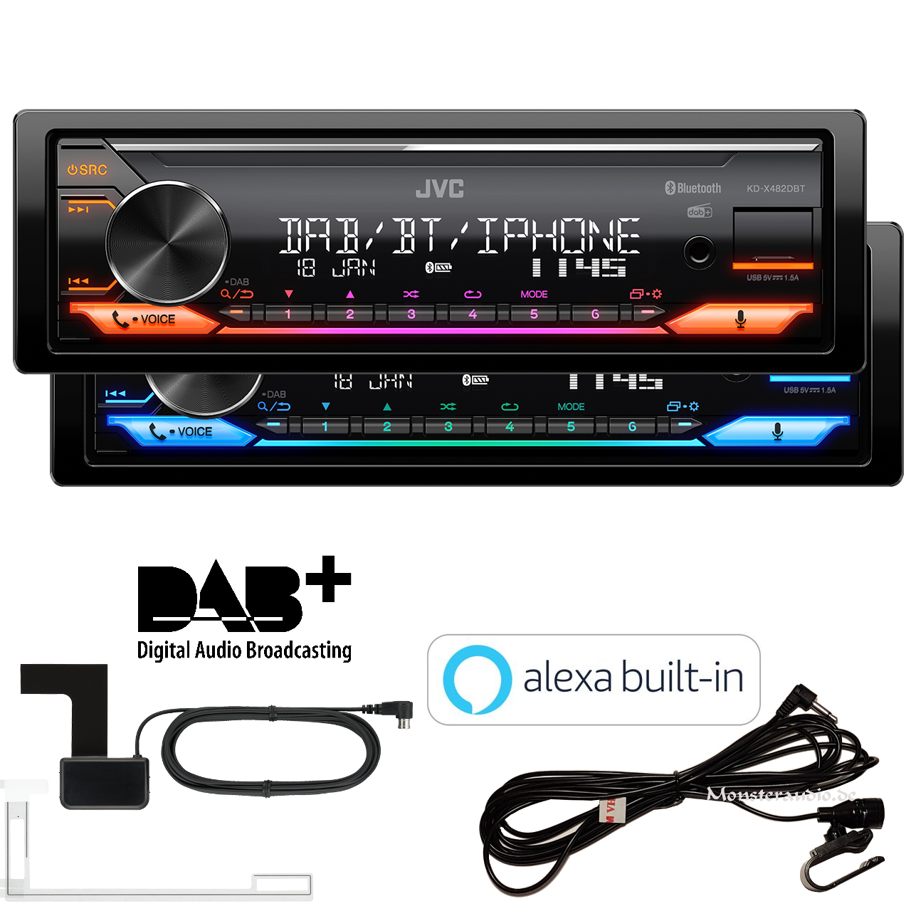 Der Media-Receiver KD-X482DBT lässt sich dank seiner geringen Einbautiefe von gerade mal 100mm problemlos installieren und bietet dank empfangsstarkem DAB+ Empfänger nicht nur brillanten digitalen Radiosound, sondern ist mit USB und Bluetooth auch ein vielseitiger Unterhaltungskünstler und komfortabler Smartphone-Allrounder. Mit der Integration der Amazon Alexa Funktion lässt sich die digitale Sprachassistentin nun auch komfortabel über das Autoradio nutzen.