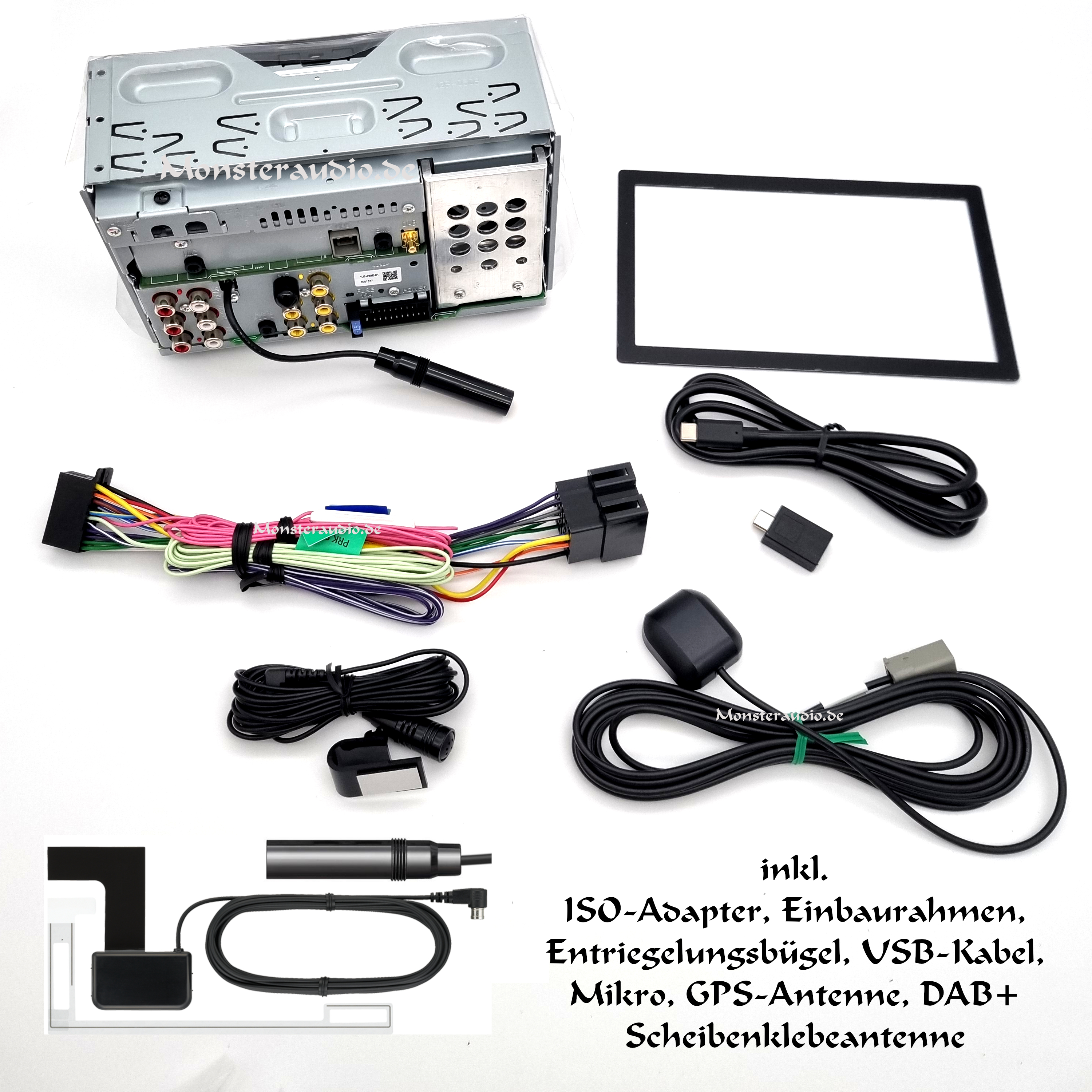 ISO-Adapter, Einbaurahmen, Entriegelungsbügel, USB-Kabel, Mikro, GPS-Antenne, DAB+ Scheibenklebeantenne, Anleitung