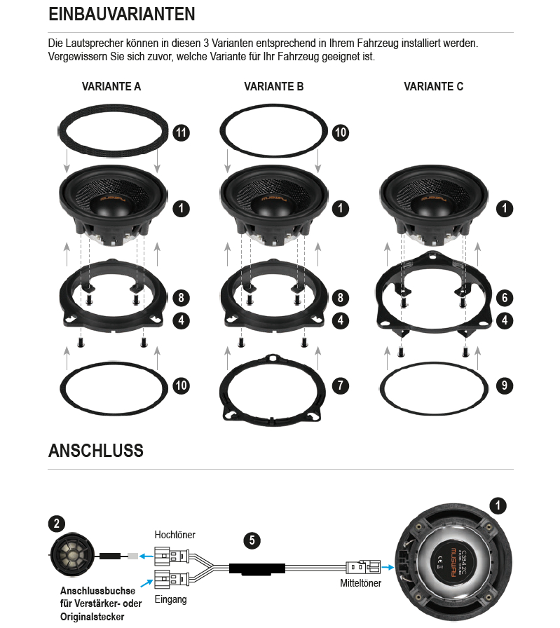Wer seinem BMW Fahrzeug diese Neuentwicklungen verordnet, der darf sich über deutlich besseren Klang in Verbindung mit höherer Belastbarkeit freuen und wird sich gerne vom Ab-Werk-Sound verabschieden! Alle Modelle sind mit einer stabilen aber ultraleichten Glasfaser-Membran ausgestattet und besitzen einen Dual-Neodym-Antrieb mit solidem N42H-Magneten. Dies ermöglicht schon bei geringer Verstärkerleistung eine optimale Klangausbeute. Der CSB8W Subwoofer ist sogar mit einer 50 mm CCAW-Schwingspule ausgestattet, welche sehr leicht ist und dadurch einen erstaunlich guten Wirkungsgrad von 89 dB/W/m erreicht. Der 25 mm Hochtöner des Komponenten-Systems CSB4.2C besitzt eine überaus wertigen Titan-Membran und ebenfalls einen kräftigen Neodym-Magnet Antrieb. Beides gewährleistet einen linearen Frequenzgang bis über 20 kHz und eine fantastische Hochton-Auflösung. Alle Modelle haben fahrzeugspezifische Anschlüsse für die einfache Montage.