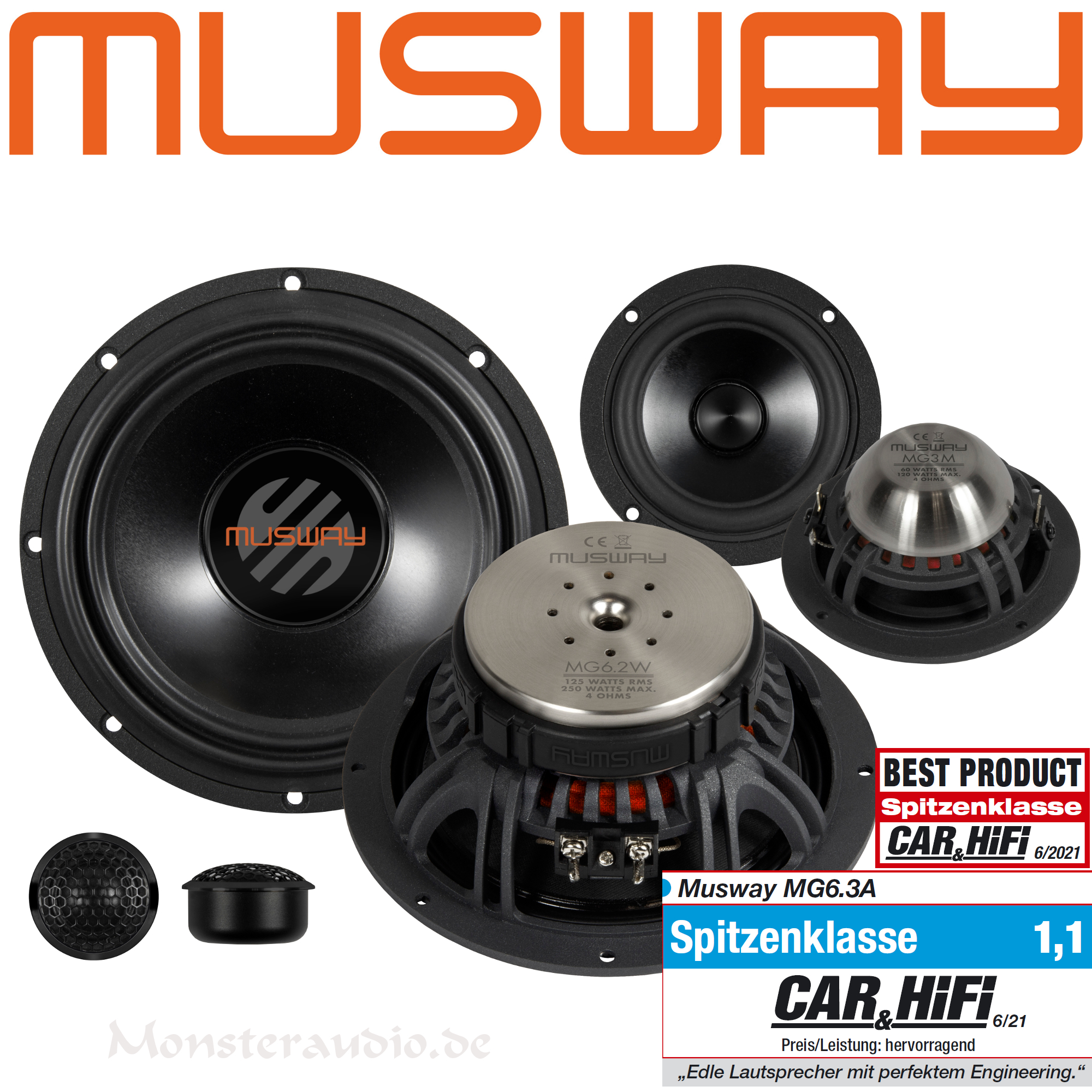 Anspruchsvolle Musikliebhaber entscheiden sich immer häufiger für MUSWAY Produkte. Gerade die Verstärker, ob mit oder ohne integrierten DSP, sind für höchste Ansprüche hervorragend geeignet. Mit der neuen High End MG Lautsprecher schlägt MUSWAY nun ein weiteres Kapitel für preisgekrönte Produkte auf, dieses Mal jedoch im Bereich Lautsprecher. Eins gleich vorweg: Das MG6.3A wurde im Fachmagazin Car & Hifi 06/2021 auf Anhieb und mit Bravour zum „BEST PRODUCT“ gekürt. Besonders beeindruckt zeigte sich die Redaktion von den sensationell geringen Verzerrungen der Lautsprecher, die “zu den saubersten der letzten Jahre gehören“.