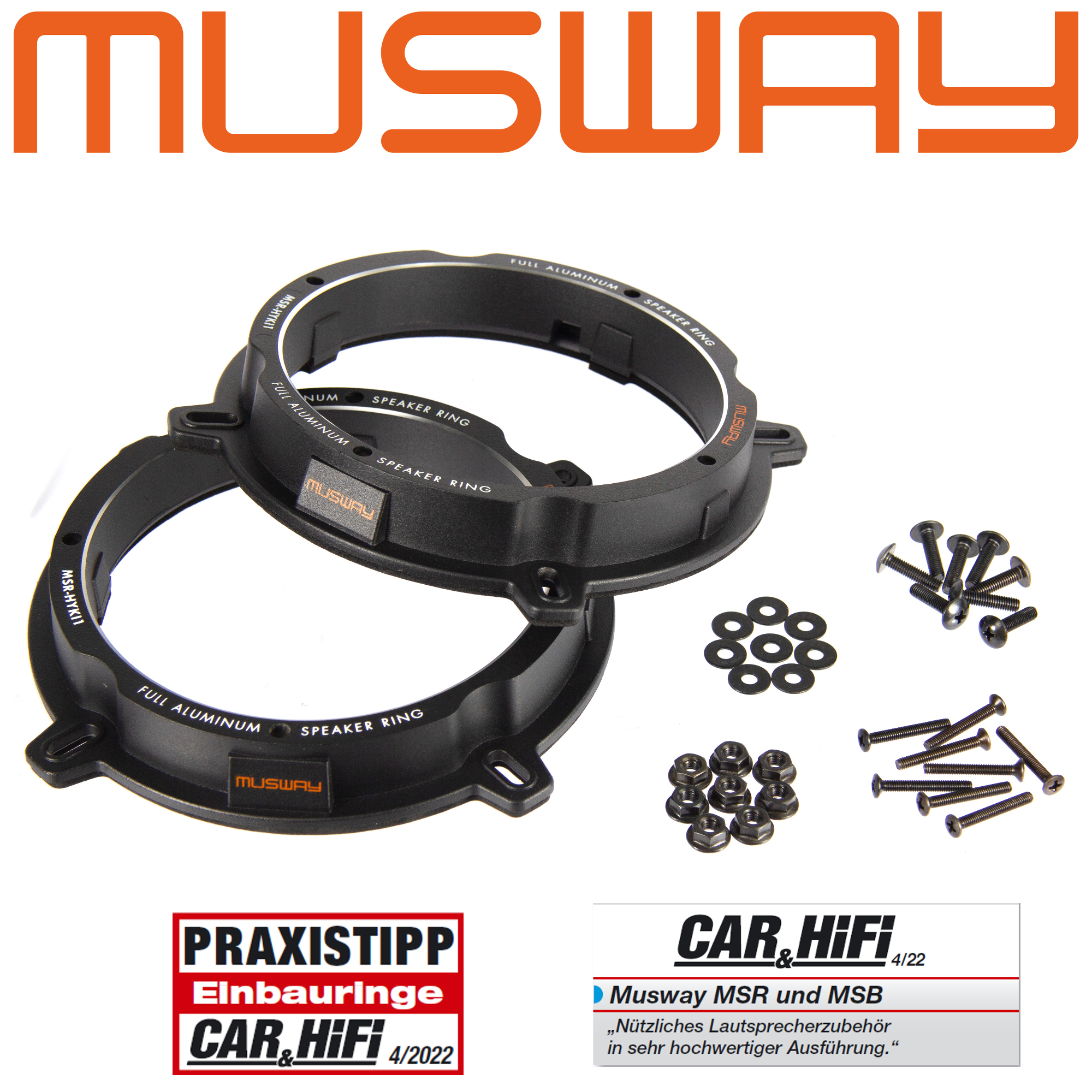Die MUSWAY Adapterringe überzeugen schon beim Auspacken mit hoher Anfassqualität, denn das satte Gewicht der aus vollem Aluminium gefertigten Einbauringe liegt extrem gut und schwer in der Hand. Auf der Unterseite befindet sich ein rundum aufgeklebter Schaumstoffring, der eine optimale Dichtung zwischen Adapterring und Fahrzeugblech bietet. Genial: Unter der Dichtung wurden im Alu-Adapterring massive Messingmuttern eingearbeitet. Diese bieten den mitgelieferten M4 Gewindeschrauben perfekten Halt für den zu montierenden Lautsprecher. Kombiniert man die MSR Adapterringe zusätzlich mit den MSB165 Silikon-Manschetten, sind ideale „Arbeitsbedingungen“ für die Lautsprecher geschaffen. Dem audiophilen Klanggenuss steht nichts mehr im Wege.