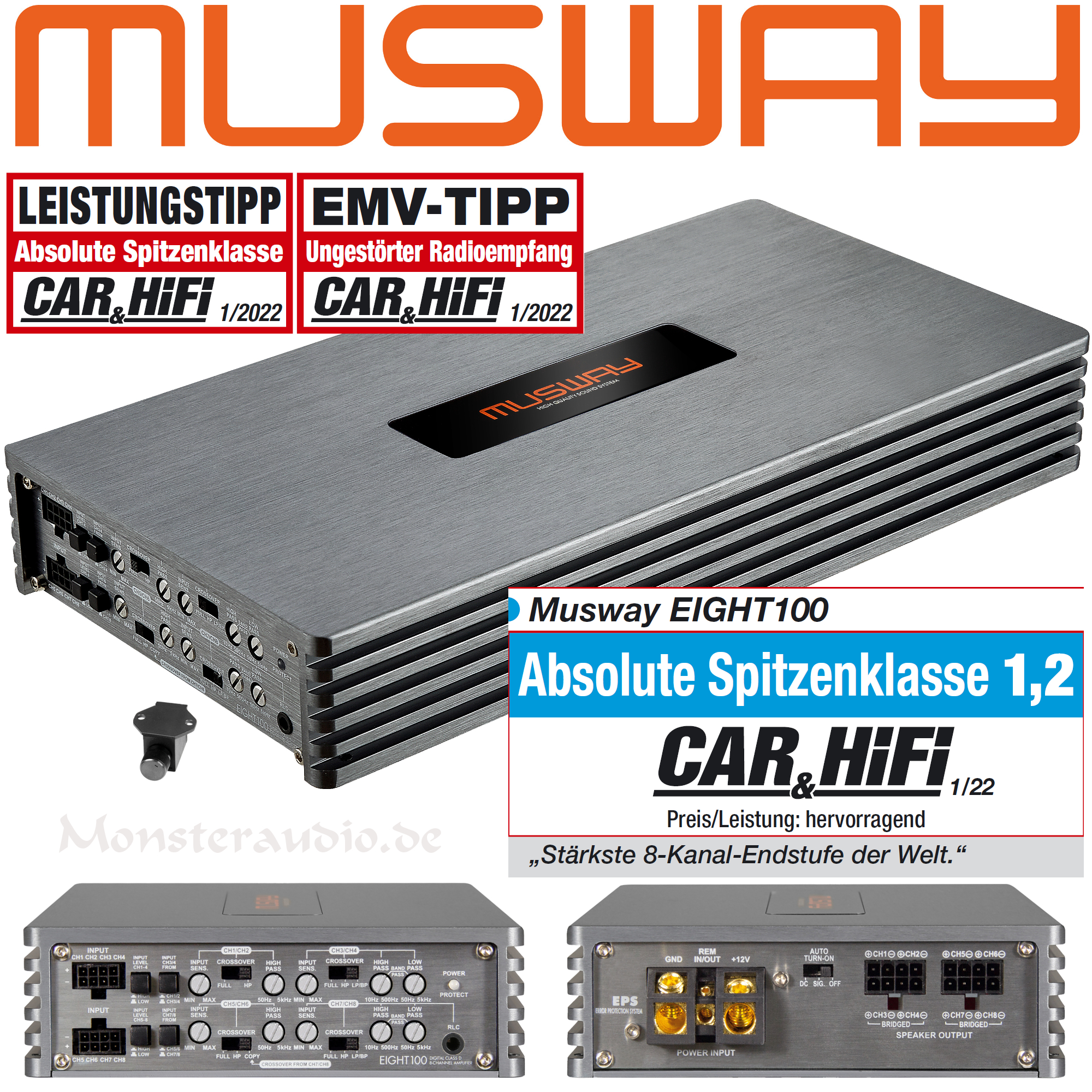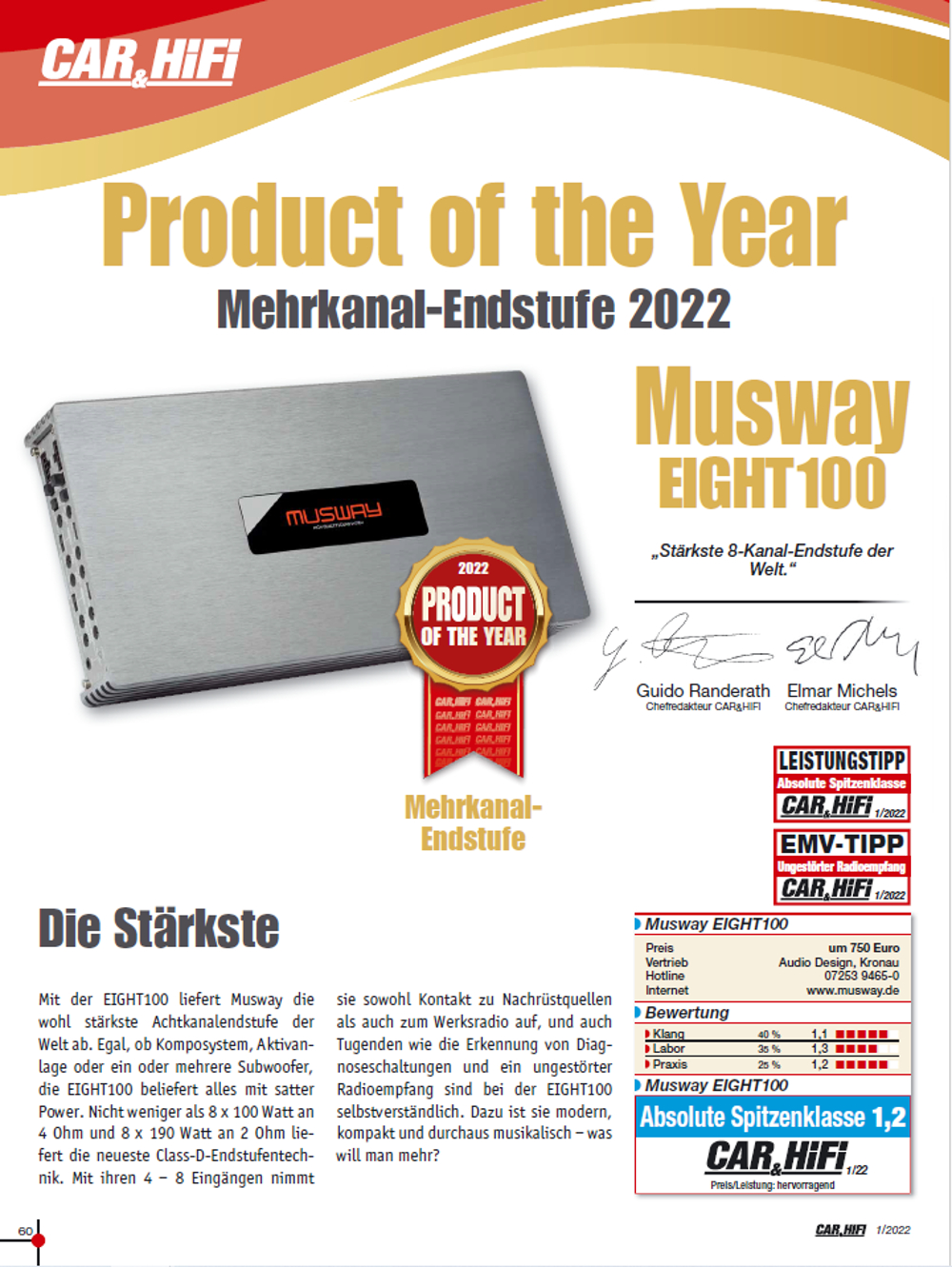 Mit dem Prädikat „Stärkste 8-Kanal-Endstufe der Welt“ legt die edle MUSWAY EIGHT100 in der Car & Hifi 1/2022 gleich einen furiosen Start hin. Doch nicht nur das – sie heimste zusätzlich auch noch den begehrten Titel „Product of the Year 2022“ in der Kategorie „Mehrkanal-Endstufe“ ein. Damit avanciert der neue Superamp aus der MUSWAY MX Serie zum stärksten 4- als auch 8-Kanal Verstärker, der jemals im Car & Hifi Testlabor von Chefredakteur Elmar Michels gemessen wurde: So bietet er gleich satte ACHT verstärkte Kanäle mit je 190 Watt an 2 Ohm, gebrückt sind 4 x 380 Watt RMS möglich. Bedenkt man, wie kompakt das Multikanalwunder ist, kommt man aus dem Staunen erst recht nicht mehr heraus. Der „Footprint“ der EIGHT100 ist sogar deutlich kleiner als ein DIN A4 Blatt. Die Redaktion packte den Verstärker schlussendlich in die Kategorie „Absolute Spitzenklasse“ und verlieh ihm beeindruckt mit „hervorragend“ das bestmögliche Preis-/Leistungsverhältnis. Mit so vielen Auszeichnungen versehen übertreffen die MUSWAY Ingenieure ihr bisheriges Meisterstück, die 6-kanalige SIX100, noch einmal. WELTKLASSE!!!
