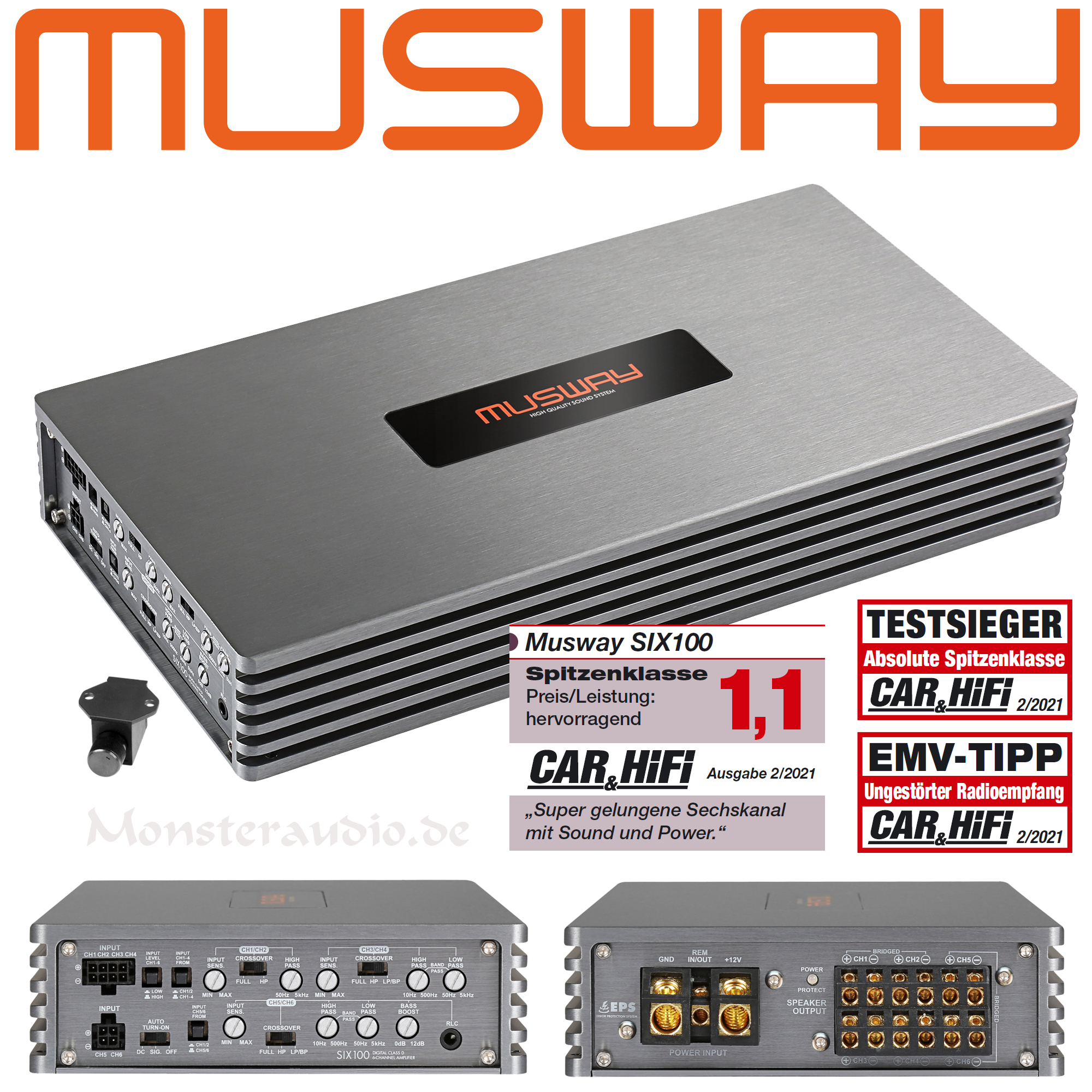 Die neuen Verstärker der MX Serie eignen sich bestens, um nicht nur optisch geniale Kombinationen mit den MUSWAY DSP Verstärkern M4+, M6 oder D8 einzugehen. Selbstverständlich sind sie auch perfekt um mit dem TUNE12, DSP68PRO oder DSP68 Stand-Alone Prozessor ein High End Team zu bilden. Mit den MX Modellen ist es somit möglich, kraftvolle 7, 8 Kanal oder gar 12-Kanalkombis zu verwirklichen. Die edel gestalteten Amps vermitteln schon beim ersten Anfassen ihre Qualitäten: Kein klapperndes Blech, Kühlkörper und Endpanels aus gebürstetem Aluminium sowie ein plan eingelassenes MUSWAY-Logo oben.