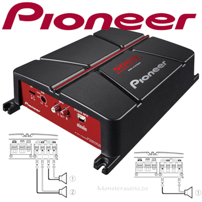 Bei Anschluss an einen OEM-Receiver oder einen Receiver ohne RCA-Ausgang über Lautsprecherkabel wird der Verstärker gleichzeitig mit dem Receiver eingeschaltet. Die Verstärker von Pioneer erkennen automatisch das Eingangssignal und wählen den RCA-Pegel oder den Lautsprecherpegel.