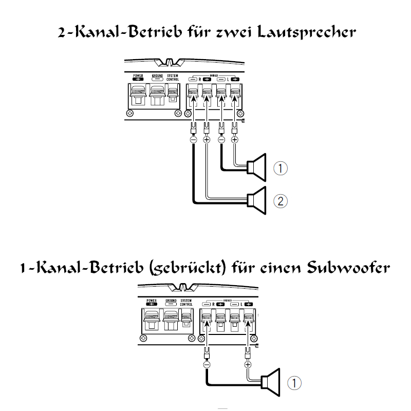 1 x 500 Watt/MAX gebrückt 4 Ohm