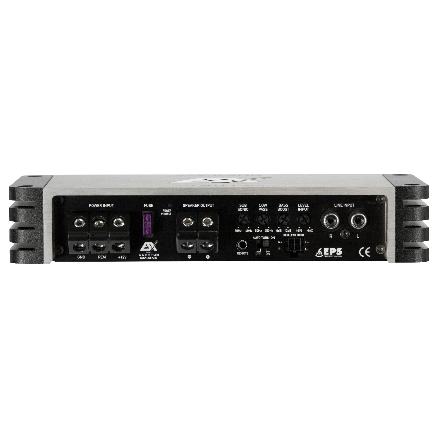 Die in etwa handtellergroße 2-Kanal Mini-Endstufe QUANTUM QM-TWO sorgte gleich nach der Vorstellung bei ESX-Fans und Kennern der Car Hifi Szene für Verblüffung. Das kleine Powerhouse mit satten 240 Watt RMS Leistung wurde sofort als Geheimtipp gehandelt. Nachdem letztes Jahr die verbesserte V2-Version mit sagenhaften 300 W RMS Leistung das nochmals toppte, legt ESX nun mit zwei weiteren Modellen in der QM-Klasse nach: Für 4- Kanal Anwendungen steht ab sofort die klangstarke Endstufe QM-FOUR bereit, wer einen separaten Subwoofer antreiben möchte, kann jetzt zum neuen Monoblock QM-ONE greifen. Beide Powerriegel leisten satte 360 Watt RMS und sind optisch perfekt aufeinander abgestimmt. In allen Modellen kommt moderne und effiziente Class D Technologie zum Einsatz, kombiniert mit EPS, Top-Features und perfekten Klangeigenschaften. Der QM-ONE Monoblock ist nicht nur optisch der perfekte Spielpartner passend zur QM-FOUR. Wenn zusätzlich ein separater Woofer befeuert werden soll, ist sein Einsatzgebiet klar definiert. Mit satten 360 Watt RMS an 2 Ω ist für ausreichend Dampf gesorgt, sogar bequem per Basspegel-Fernbedienung einstellbar.