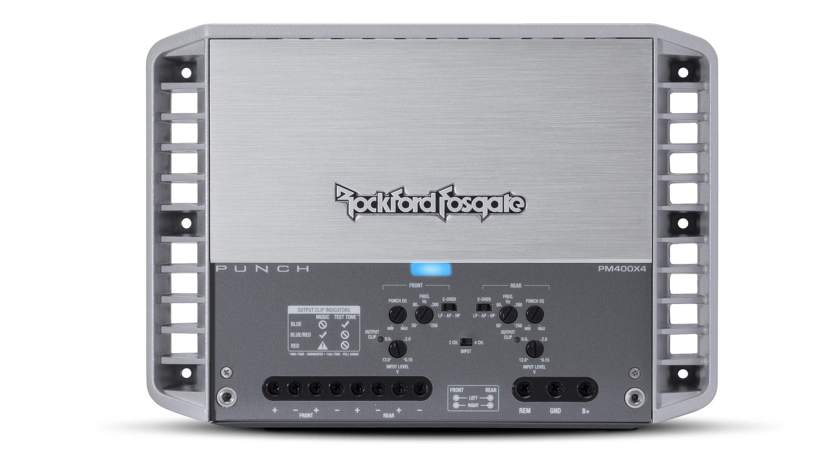 Der Mehrkanalverstärker Punch PM400X4 ist vielseitig, um jede Audiosystemkonfiguration mit Strom zu versorgen. Zusätzlich zum 4-Kanal-Stereomodus können Sie beide Kanäle überbrücken, um einen leistungsstarken 2-Kanal-Verstärker zu erstellen, oder Stereolautsprecher auf der Vorderseite mit Subwoofern auf der Rückseite im 3-Kanal-Modus betreiben. Die variable HP/LP-Frequenzweiche und der integrierte Punch-EQ ermöglichen eine präzise Abstimmung der Bassfrequenzen, und die Pass-Thru-RCA-Buchsen bieten Flexibilität, wenn Ihr System wächst, und halten Y-Adapter auf einem Minimum.