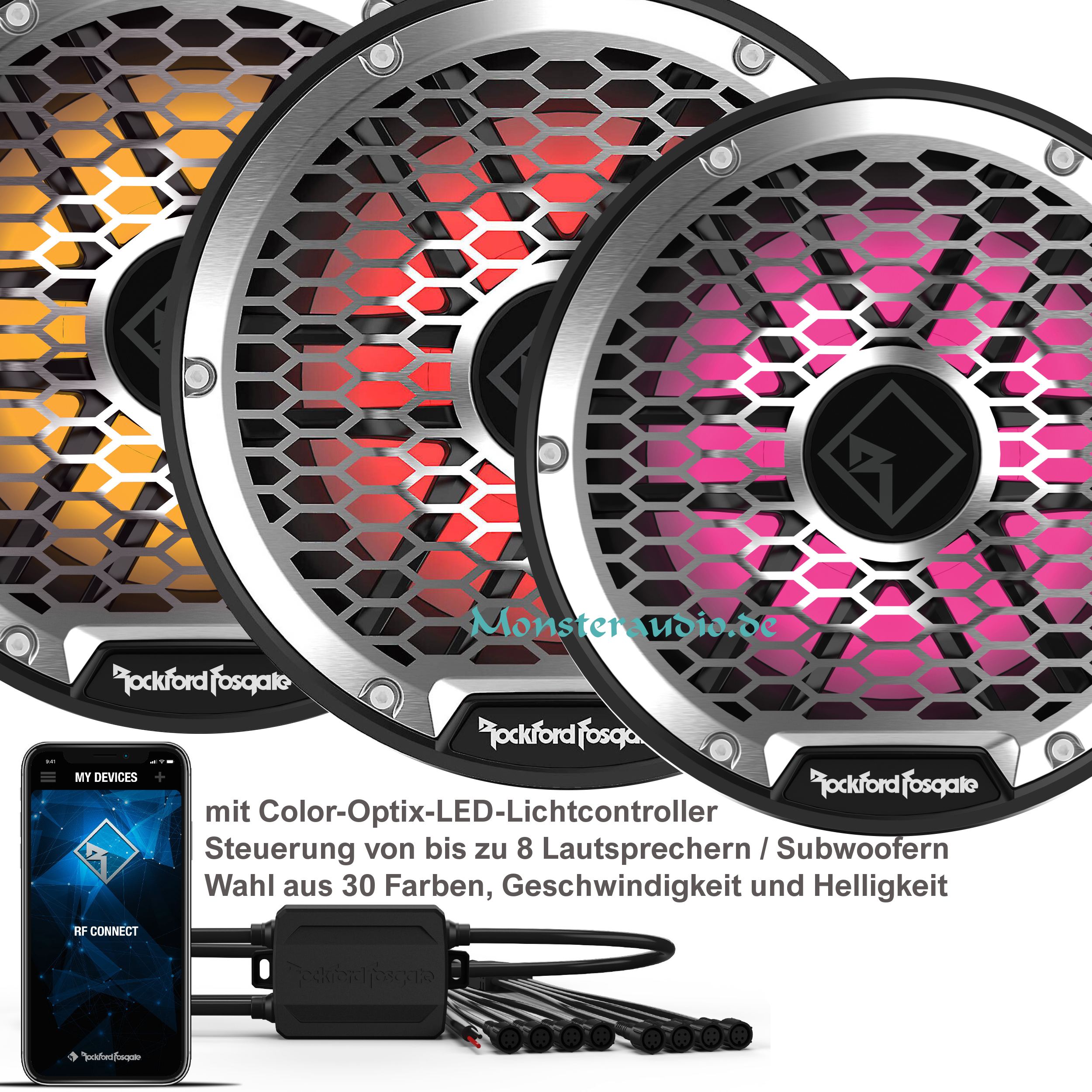 Die Color Optix™ Subwoofer liefern laute, klare und präzise Bässe und leuchten den Weg für Ihre Reise! Die Subwoofer verbinden sich mit dem Rockford Fosgate Color Optix™ Controller und der RF Connect App, sodass Sie Ihre eigenen Farbmuster anpassen können. Das Element Ready™-Design und die IP67-Zertifizierung machen sie zu einer echten Spezialkonstruktion für Schiffs- oder Motorsportanwendungen, bei denen Schutz vor schädlichen UV-Strahlen und Spritzwasser unerlässlich ist.